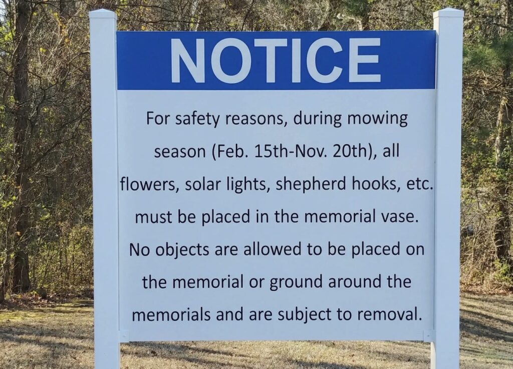 For safety during mowing season (Feb. 15 – Nov. 20), all flowers, solar lights, shepherd hooks, and decorations must be placed inside the memorial vase. Items outside of vases are subject to removal.
